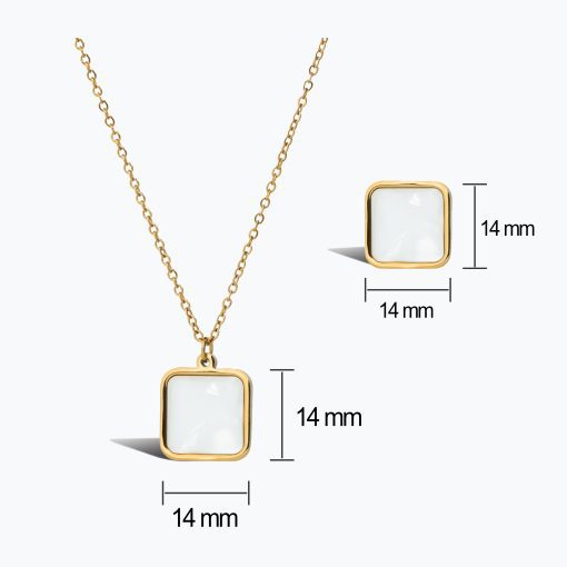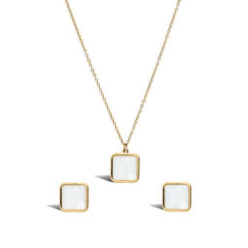 Effortlessly elegant and beautifully refined, Elara Luxe Set embodies the art of timeless sophistication. This graceful pairing of a necklace and matching earrings showcases a delicate square motif with a lustrous white shell inlay, framed in radiant gold tones. Its soft sheen and balanced design make it a piece that transitions seamlessly from day to evening.