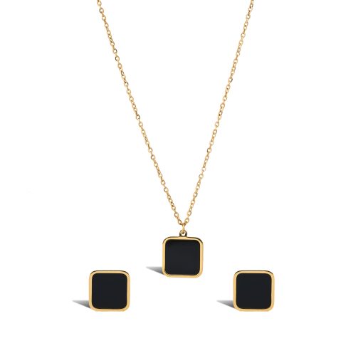 Striking and sophisticated, Noctura Luxe Pendant Set embodies the allure of modern elegance. The necklace and earring duo feature a bold square design adorned with a deep black shell inlay, beautifully framed in radiant gold. Its contrasting tones create a look that’s both contemporary and timeless — perfect for adding refined drama to any occasion.