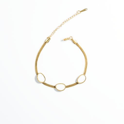 Elegant and serene, Selene Shell Bracelet reflects the gentle glow of moonlight through its refined design. The smooth snake chain is adorned with irregular oval motifs, each set with a luminous white shell inlay that catches the light beautifully. Effortlessly chic, it brings a touch of quiet sophistication to both everyday looks and special occasions.