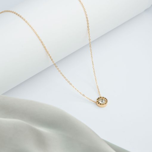Elegant and symbolic, Eterna Aura Necklace captures the beauty of timeless grace. The round pendant features a radiant central stone framed by a polished golden border, encircled with engraved Roman numerals — a subtle homage to the passage of time and everlasting elegance. Its balanced design and refined finish make it a piece that complements every occasion with effortless sophistication.